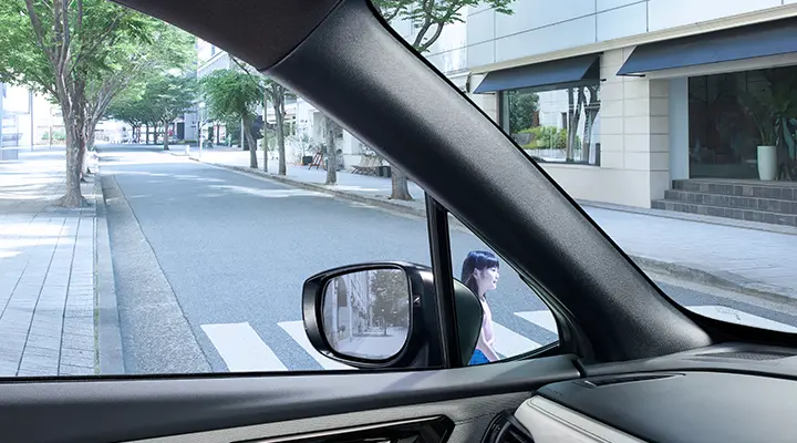 上下左右に広いフロントガラス、フロントドアウインドゥの三角窓、細めに設計した窓の支柱、周囲を映し出すカメラなど、運転席からの死角を減らすためのさまざまな工夫を取り入れています。