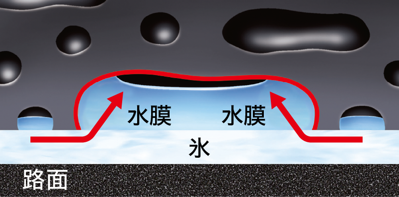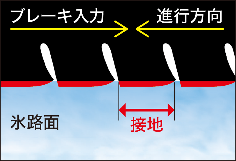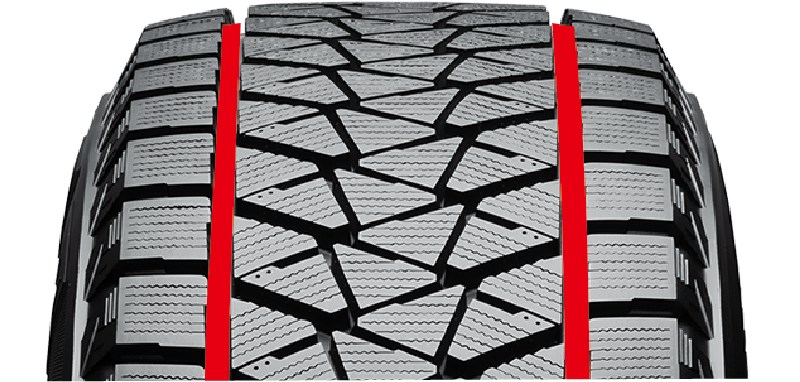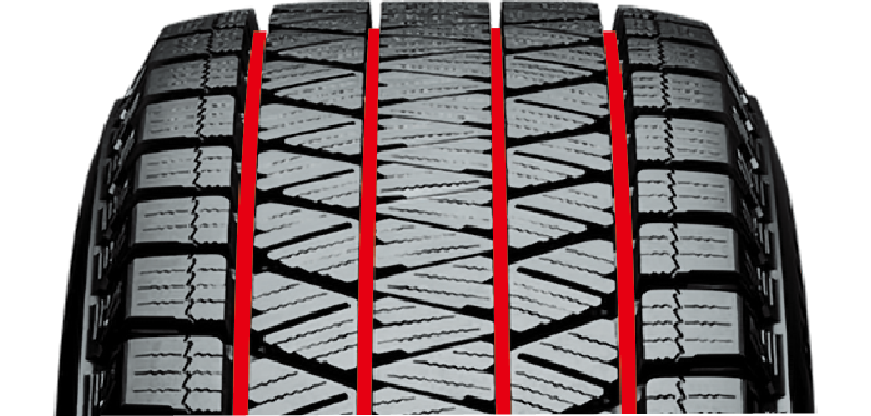 ラグ溝(横溝)を従来より増やすことで、雪を「つかむ」・氷を「ひっかく」機能を強化し、氷雪上での力強いグリップを発揮。