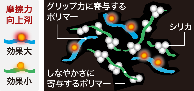 さらに、「摩擦力向上剤」がポリマーと効果的に結合することで、トレッドゴムが接地面で粘りを発揮し、グリップ力が大幅に向上。