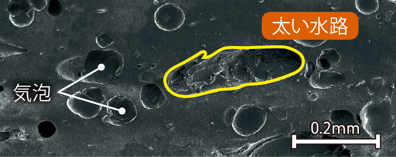 親水作用による吸水力を備えつつ、水路の断面形状を楕円形にすることで毛細管現象により吸水力が向上。