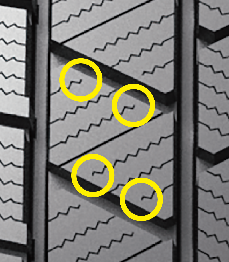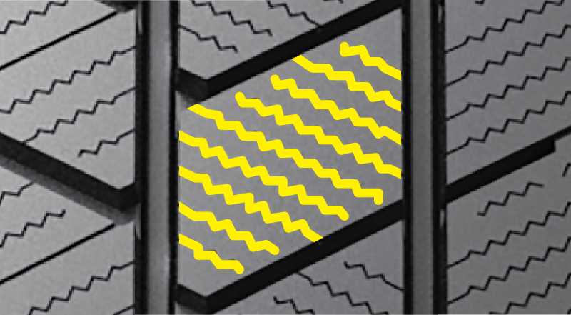 ブロック形状、向きに応じてサイプの角度を適正に配置。サイプのエッジ効果を増加させ氷雪上での力強いグリップを確保しながらブロック剛性を向上。