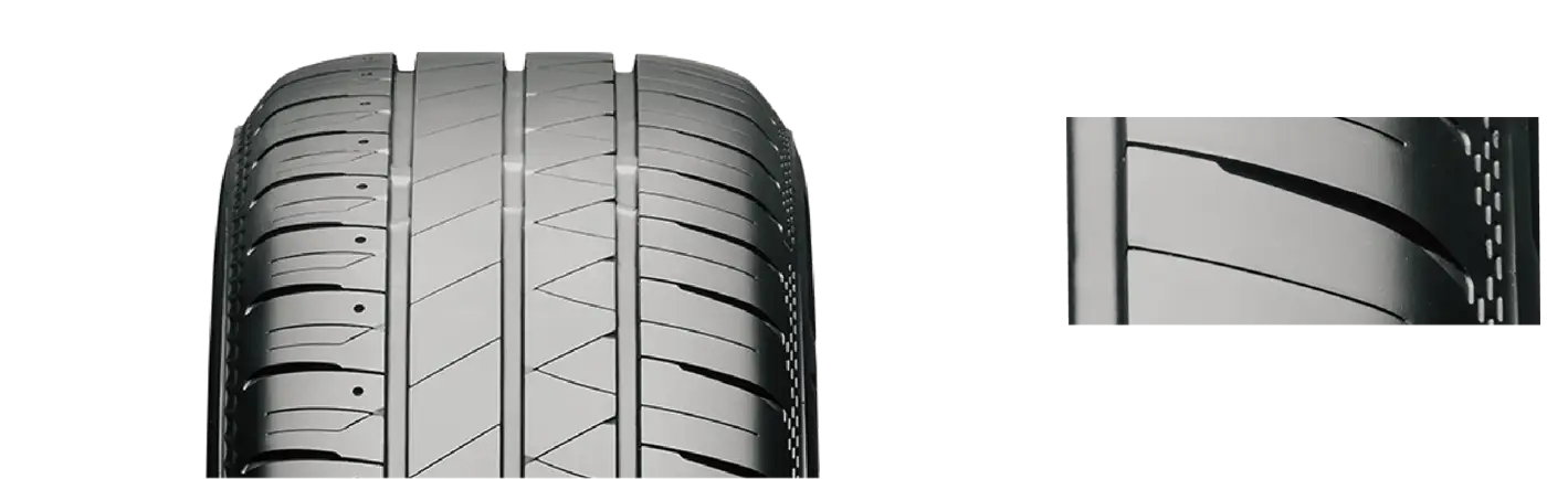 ラグ溝の溝幅を接地端に向けて広くすることで、排水性が向上。