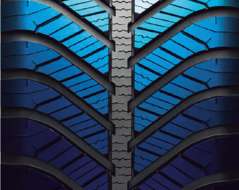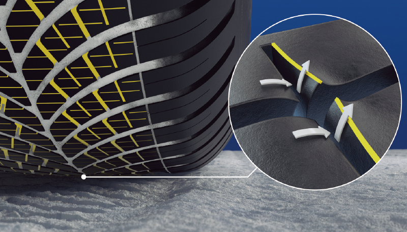トレッド中央部に大型のサイプを配置することで多くの雪を排出。さらにサイプ交差点の開口部が広がることで、高い雪上グリップ力を実現。