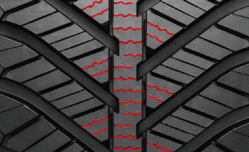 センターエリアのサイプ側面にワッフル状の凹凸を形成。ブロック間が支えあい、高い剛性を生み出します。
