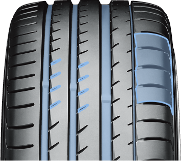斜めに角度のついたカーカスプライを、トレッド付近までターンアップ。重なる部分のプライを交差させることにより、周方向の剛性を向上させた。乗り心地を損なうことなく、ステアリングの正確性を向上。またパワーを確実に路面へ伝えることで、ドライ性能にも貢献します。(採用されていないサイズもございます。)