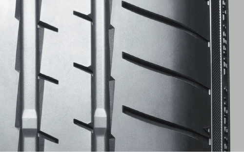 センターリブの両側とその他リブのアウト側に施した稲妻型の切り込みが水幕を切るエッジ効果を発揮。溝面積を増加させつつリブ剛性を確保することでウェット性能、ハンドリング性能を両立。