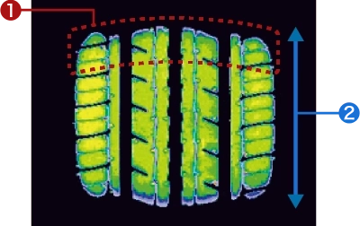 - ❷センター部の接地長を長くすることで直進安定性を確保。