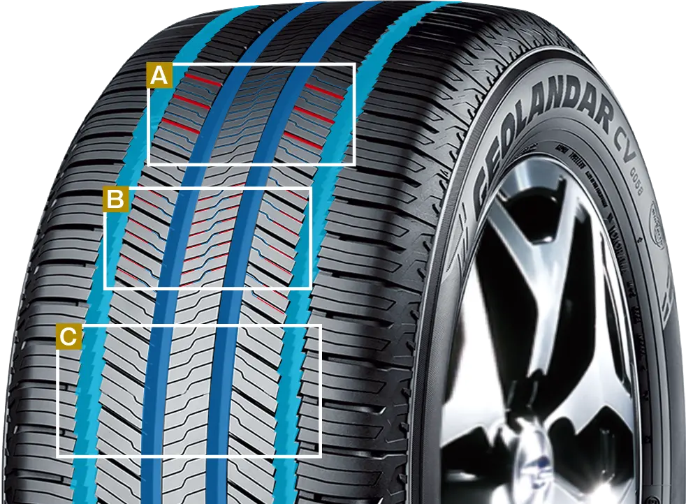 2Dと3Dのサイプを組み合わせ、エッジ効果を高めつつ剛性も確保。耐偏摩耗性能に寄与するとともに、ウェット路面や急な降雪時には優れたトラクションを発揮します。