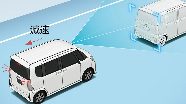 ■歩行者が大きな荷物を持っているなど、ステレオカメラが歩行者として正しく認識できない場合は作動しません。 ■状況によっては、衝突回避支援ブレーキ機能が作動せず、衝突の回避、被害の軽減ができない場合があります。 ■衝突回避支援ブレーキ機能作動中にアクセルペダルを踏んだ場合等には、作動を解除する場合があります。 ■衝突回避により車両停止後、衝突回避支援ブレーキ機能が解除されます。クリープ現象により前進しますので、停止後は必ずブレーキペダルを踏んでください。 ■衝突回避支援ブレーキ機能は、主に先行車、歩行者に作動します。ただし、電柱、壁などに対しても作動することがありますが、これらへの衝突を回避することを目的とはしていません。 ■車両、二輪車、自転車、歩行者の割り込み、飛び出しには対応できません。 ■被害軽減ブレーキアシスト機能は、速度差が約30~約120km/h(対歩行者の場合は、約30~約60km/h)で作動します。 ■このほかスマートアシストについて重要な注意事項が記載されておりますので、詳しくは取扱説明書をご覧ください。