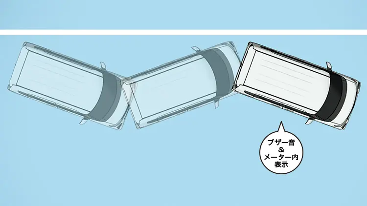 車線からはみ出しそうになると、警報音と表示でお知らせ。さらに、車線内に戻すようにハンドル操作をアシストします。