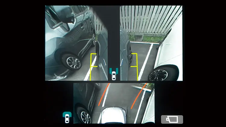 道路端への幅寄せ、駐車時などに死角になるエリアの確認をカメラでサポートします。車両を真上や斜め上から見たような表示も採用し、運転席からは見えにくい部分をリアルタイムに確認できます。