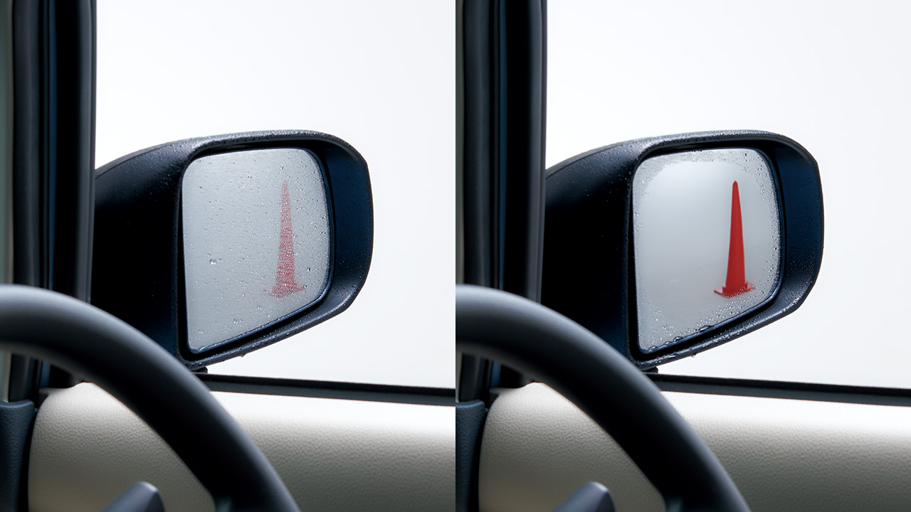 水滴を膜のように広げて鏡面をクリアに保つ親水処理によって視認性を向上。親水性は日光が当たると回復します。