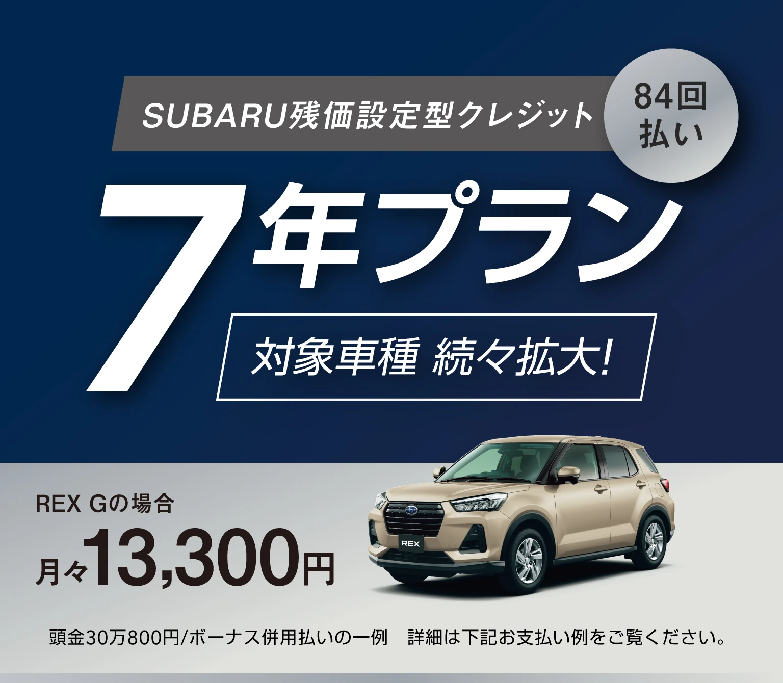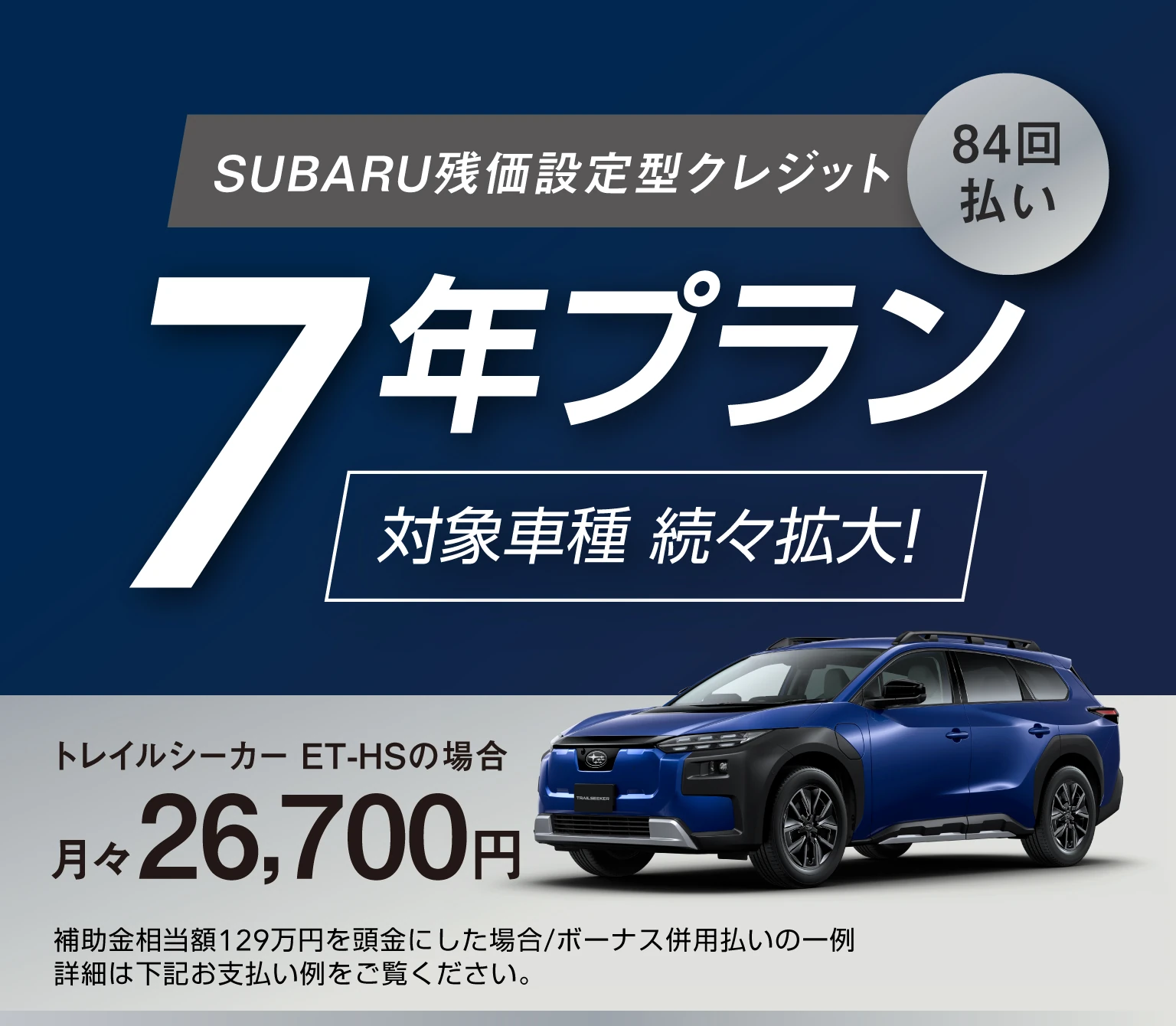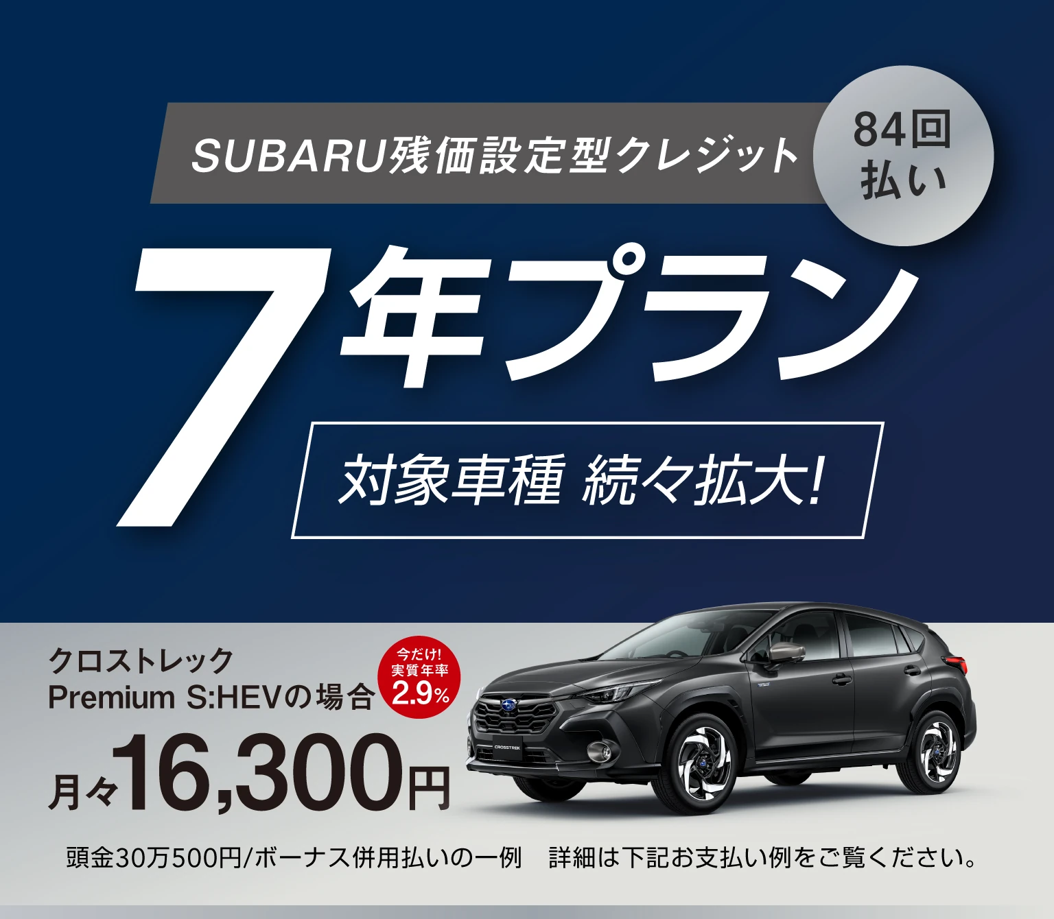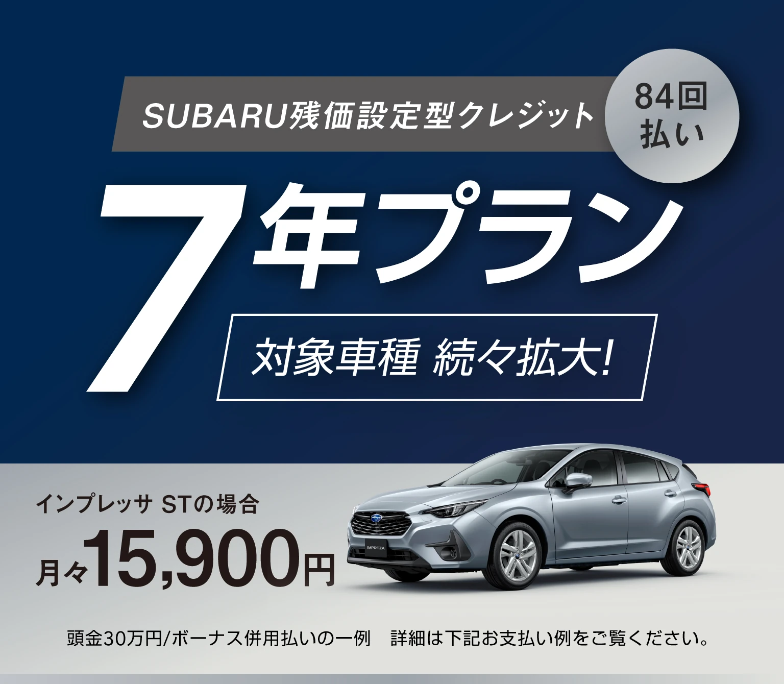 [残価設定型クレジットについて]●お支払い例の金額は参考です。●お支払い例には保険料、税金、登録に伴う諸費用、リサイクル料、及びディーラー装着オプションの代金は含まれておりません。これらの費用は別途申し受けます。●最終回お支払い時には「車両返却」「再分割」「現金一括払い」よりお選びいただけます。●車両返却、または車両を返却してスバル新車にお乗りかえの場合、残価の支払いは不要です。但し、事故や内外装の損傷、走行距離等について一定の条件があり、条件に合致しない場合にはお客様のご負担が発生します。●審査の結果、お客様のご希望に添えない場合がございます。●お取り扱いできないスバル販売店がございます。●トランスケア商品等、改造車については一部取り扱いできない商品がございます。●取り扱い会社:スバルファイナンス株式会社●詳しくはスバル販売店へお問い合わせください。